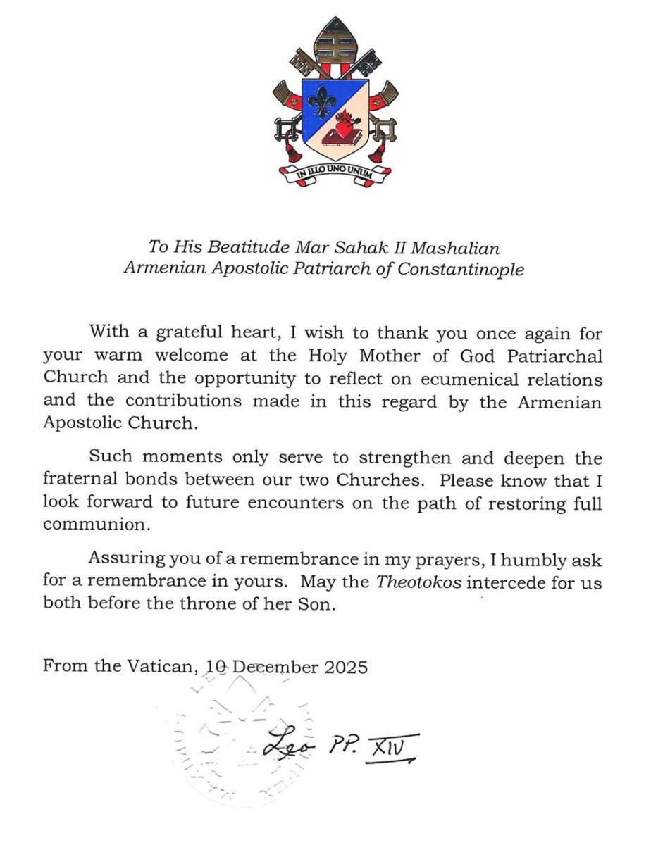 Թուրքիոյ Հայոց Պատրիարք Ամեն. Տ. Սահակ Ս. Արք. Մաշալեան շնորհակալութեան նամակ մը ստացաւ Հռոմէական Կաթոլիկ Եկեղեցւոյ Քահանայապետ Լեւոն ԺԴ. Սրբազան Պապէն։ Այս վերջինը անցեալ տարի Թուրքիա այցելած էր եւ իր կեցութեան օրերուն հիւրընկալուած՝ Գումգաբուի մէջ։