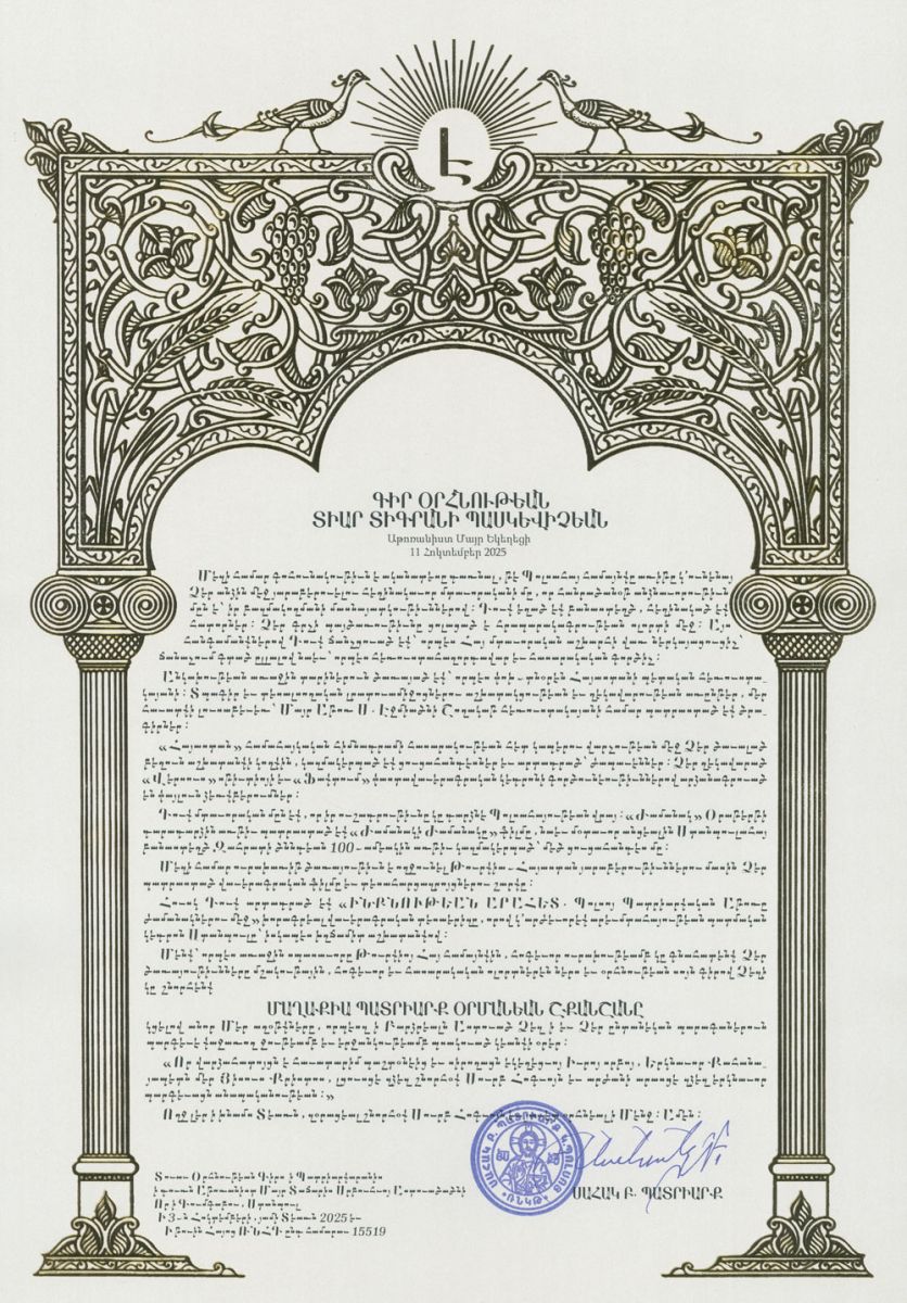 Յայտագրի այս փուլին, նախ Տ. Յարութիւն Վրդ. Տամատեան ընթերցեց Ամեն. Ս. Պատրիարք Հօր համապատասխան օրհնութեան գիրը, որու բովանդակութեան մէջ, մեծարեալի կենսագրութեան տուեալները շարադրուած էին դրուատական բանաձեւումներով։ Օրհնութեան գիրը նոյնութեամբ ներկայացուած է մեր այսօրուան Բ. էջին վրայ։