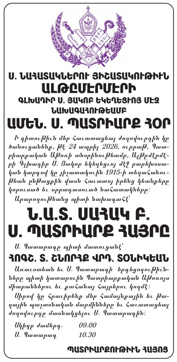 Այսօր դարձեալ 24 Ապրիլ է. օր մը, որ մեզ կը հրաւիրէ խոնարհումով կանգնելու մեր պատմութեան ամենէն ցաւալի էջերէն մէկուն առջեւ։ Այս օրը մեզ կը վերադարձնէ դար մը առաջ ապրուած ողբերգութեան յիշատակին, որ խոր հետք ձգած է մեր ազգային եւ հոգեւոր կեանքին մէջ։
